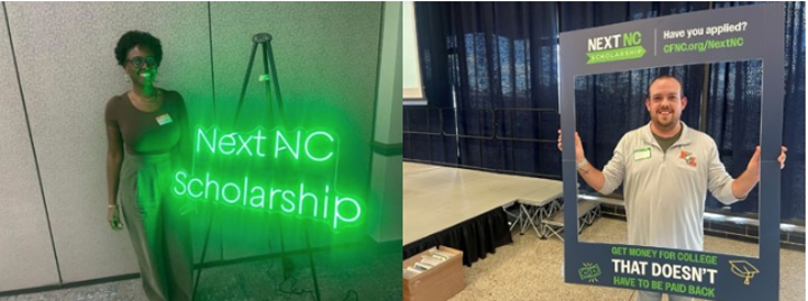 Ganadores de los cartels de neón Next NC y marco en redes sociales en las formaciones regionales de CFNC en Wake Technical Community College (izquierda) y Catawba Valley Community College