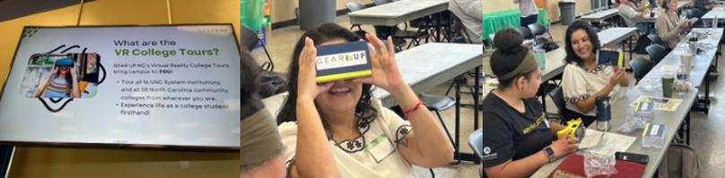 Los asistentes también pudieron conocer algunos de los recursos interesantes disponibles que quizá no habían encontrado antes. Por ejemplo, a través de GEAR UP NC, los orientadores pueden conseguir gafas de realidad virtual para usar en las visitas virtuales a universidades estatales. En las formaciones regionales, los profesionales de la educación tuvieron la oportunidad de probar la tecnología por sí mismos.