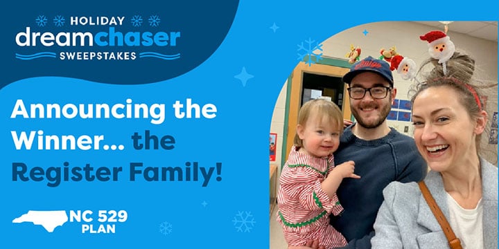 The Holiday Dream Chaser Sweepstakes concluded at the end of January and offered North Carolina families the chance to enter to win additional funds in an NC 529 Account to help save for future qualified education expenses. The annual sweepstakes is a part of the NC 529 Plan’s mission to encourage families across the state to plan and save for college and other future education goals.
